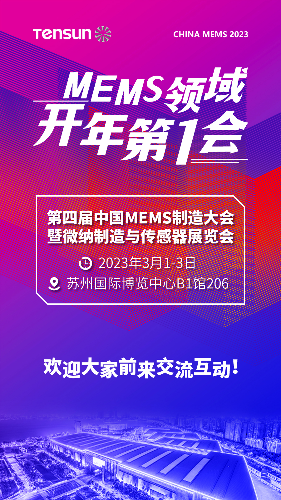 2023年3月1-3日,MEMS領(lǐng)域開年第一會——第四屆中國MEMS制造大會暨微納制造與傳感器展覽會將在蘇州國際博覽中心拉開帷幕。Tensun騰盛將應(yīng)邀參展,展位號為B1館—206,屆時(shí),將與眾多企業(yè)同行、媒體朋友共享騰盛在MEMS領(lǐng)域的技術(shù)應(yīng)用與發(fā)展,歡迎大家前來交流互動。