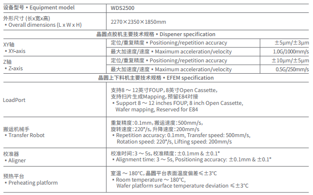 超精密晶圓級(jí)封裝點(diǎn)膠,兼容8~12英寸Wafer,重復(fù)定位精度±3μm。